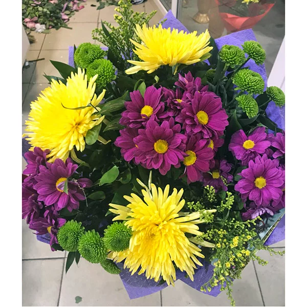 ЛЮКС: хризантема одноголовая (желтая) - 5 шт., хризантема зеленая кустовая - 5 шт., хризантема фиолетовая кустовая - 5 шт., солидаго - 5 шт., фетр фиолетовый, крафт, лента. Примерный диаметр букета 40х40 см.