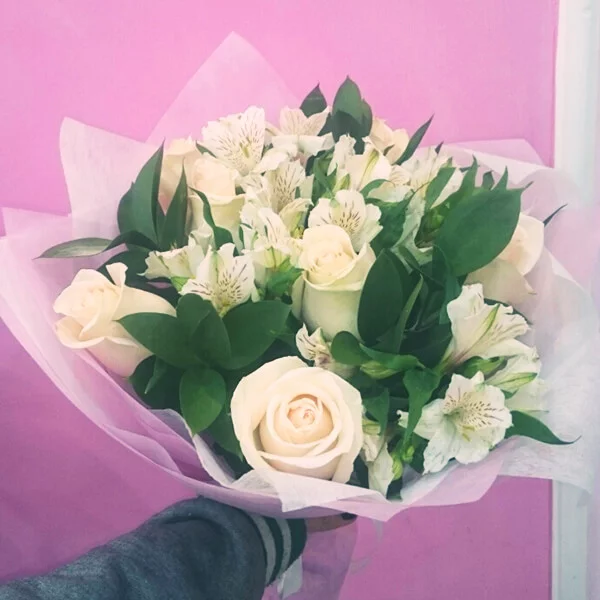 Букет выполнен из нежных кремовых роз, в дополнении кристально - белой альстромерии в окружении декоративной зелени, фетра в тон букету и розового банта.