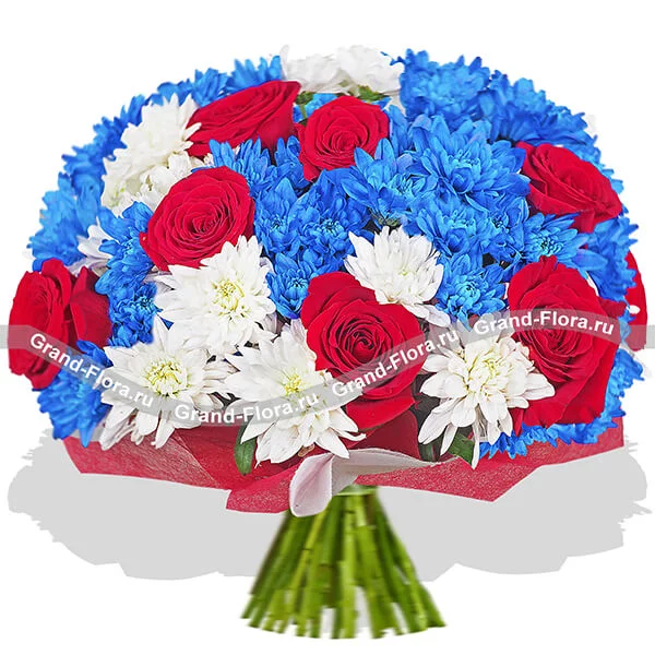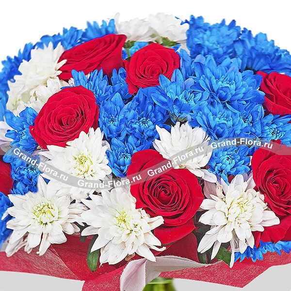 ДЕЛЮКС: роза красная - 15 шт, хризантема кустовая белая - 9 шт, хризантема кустовая синяя - 8 шт, фетр красный.