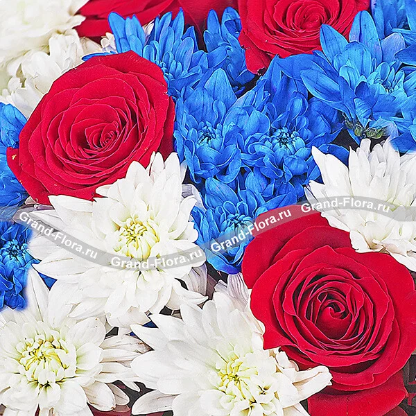 Стандартный (на фото): роза красная - 7 шт, хризантема кустовая белая - 3 шт, хризантема кустовая синяя - 2 шт, фетр красный.